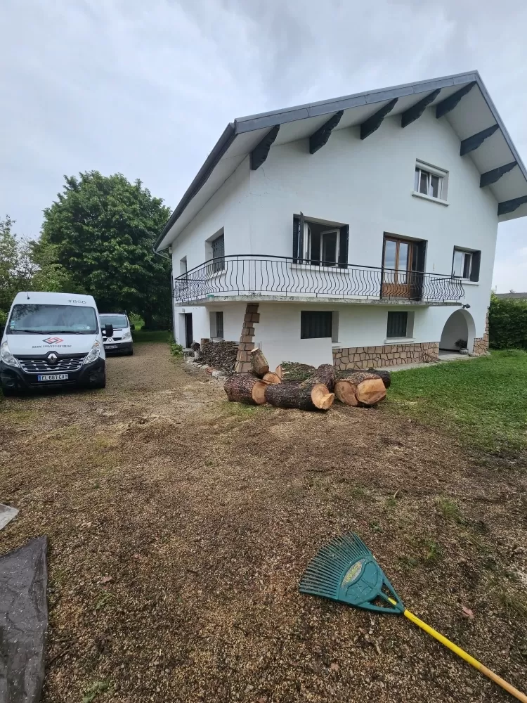 Votre élagueur à Peronnas, a effectué le démontage d'un pin sylvestre qui se trouvait au dessus d'une maison car il était infesté de chenille processionnaire, puis finition avec une rogneuse de souche pour venir creuser jusqu'en dessous de la terre. Evacuation du bois avec un tracteur